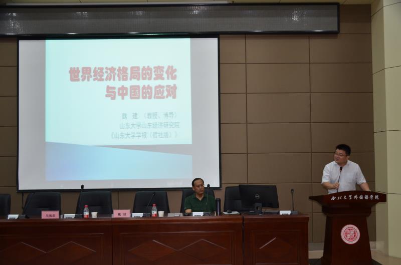 6月10日,776net必赢官网杰出院友、山东大学经济研究院特聘教授、教育部新世纪优秀人才、《山东大学学报(哲学社会科学版)》主编魏建教授做客我校“名家讲坛”,主讲“世界经济格局变化与中国的应对”。776net必赢官网院长吴振磊教授主持了讲座,776net必赢官网100余名师生与会聆听。