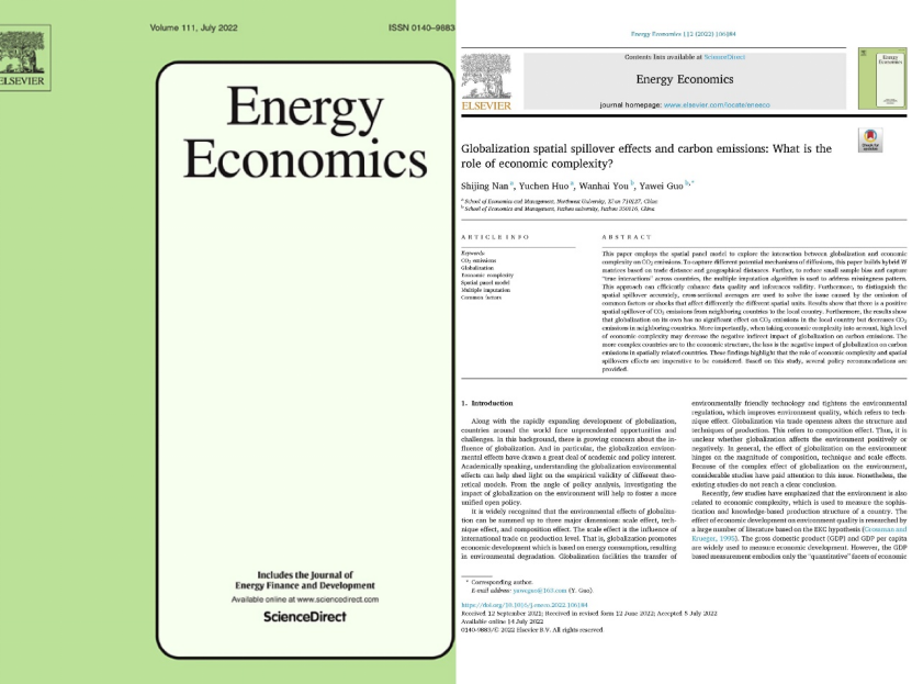 近日,我院数理经济与统计学系南士敬副教授与其指导的硕士生霍宇辰、福州大学游万海副教授和郭亚伟博士(通讯作者)合作的论文《Globalization spatial spillover effects and carbon emissions: What is the role of economic complexity?》在能源经济国际权威期刊《Energy Economics》正式发表,南士敬副教授为第一作者,我校为第一完成单位。《Energy Economics》为能源经济领域国际顶级期刊,2021年影响因子为9.252、在经济学大类中排名为9/379,是JCR经济学领域一区期刊,ABS三星期刊。