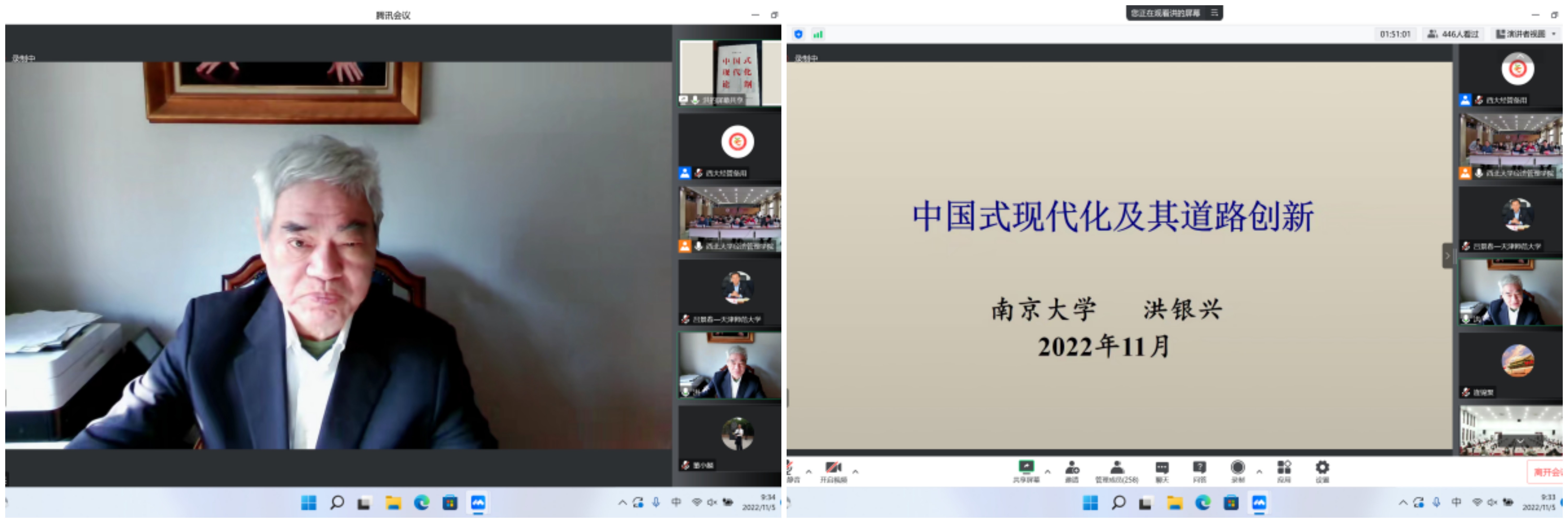 11月5日上午,年会开幕式上,西北大学校长郭立宏教授、本届年会主席西北大学白永秀教授分别致辞。开幕式后的主旨演讲阶段,中国特色社会主义经济建设协同创新中心主任、原南开大学副校长逄锦聚教授做了题为《全面贯彻习近平经济思想构建中国特色社会主义政治经济学自主理论体系》的报告,南京大学文科资深教授、原南京大学党委书记洪银兴教授做了题为《中国式现代化及其道路创新》的报告。西北大学副校长吴振磊教授主持开幕式和主旨演讲。