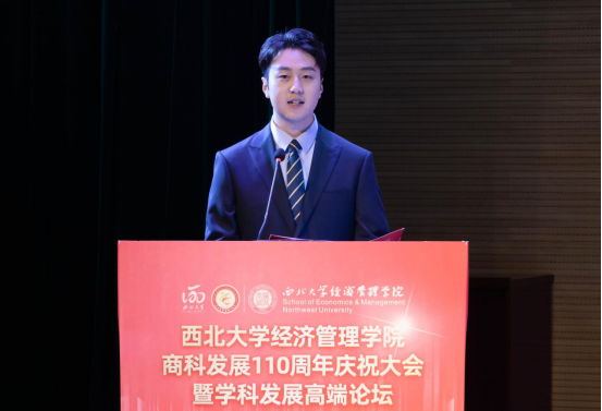 庆祝大会共分为两个阶段举行。第一阶段由西北大学副校长吴振磊教授主持。首先由陕西省人民政府学位委员会秘书长袁宁致辞,他代表陕西省教育厅和陕西省人民政府学位委员会,对西北大学商科建立110年表示热烈祝贺,对西北大学及其商科的发展成绩给予充分肯定,并对西北大学经济管理学科的发展提出了希望和要求。接下来西北大学校长郭立宏教授致辞,他代表学校向长期以来关心和支持776net必赢官网发展的社会各界和海内外校友表示感谢,并对学院提出了聚焦人才培养、聚焦一流学科建设、聚焦服务高质量发展“三个聚焦”的要求和期望。随后北京大学副校长、经济学院院长董志勇教授代表兄弟院校致辞,他对776net必赢官网表示祝贺,分享了北京大学经济学科建设的经验与做法,祝愿西北大学经管学院在立德树人、学科建设方面取得更大成绩。1978级校友,西北大学原校长、全国社会保险基金理事会原副理事长王忠民教授代表校友致辞,他表达了对母院的感恩之情,回顾了在校期间的珍贵回忆,并对数字化变革和大变局背景下学院学科发展、办学育人等给出了方向、提出了建议。最后,776net必赢官网何爱平教授代表教师发言,她回顾了在学院求学求教、教书育人的经历,表达了对老师的感恩之情,对后辈学子提出殷切期望;2019级金融学本科生李雨豪代表学生发言,他分享了一名经管学子的切身感受,并代表全体经管学子表达了对老师们的感激之情和对学院生日的祝福。