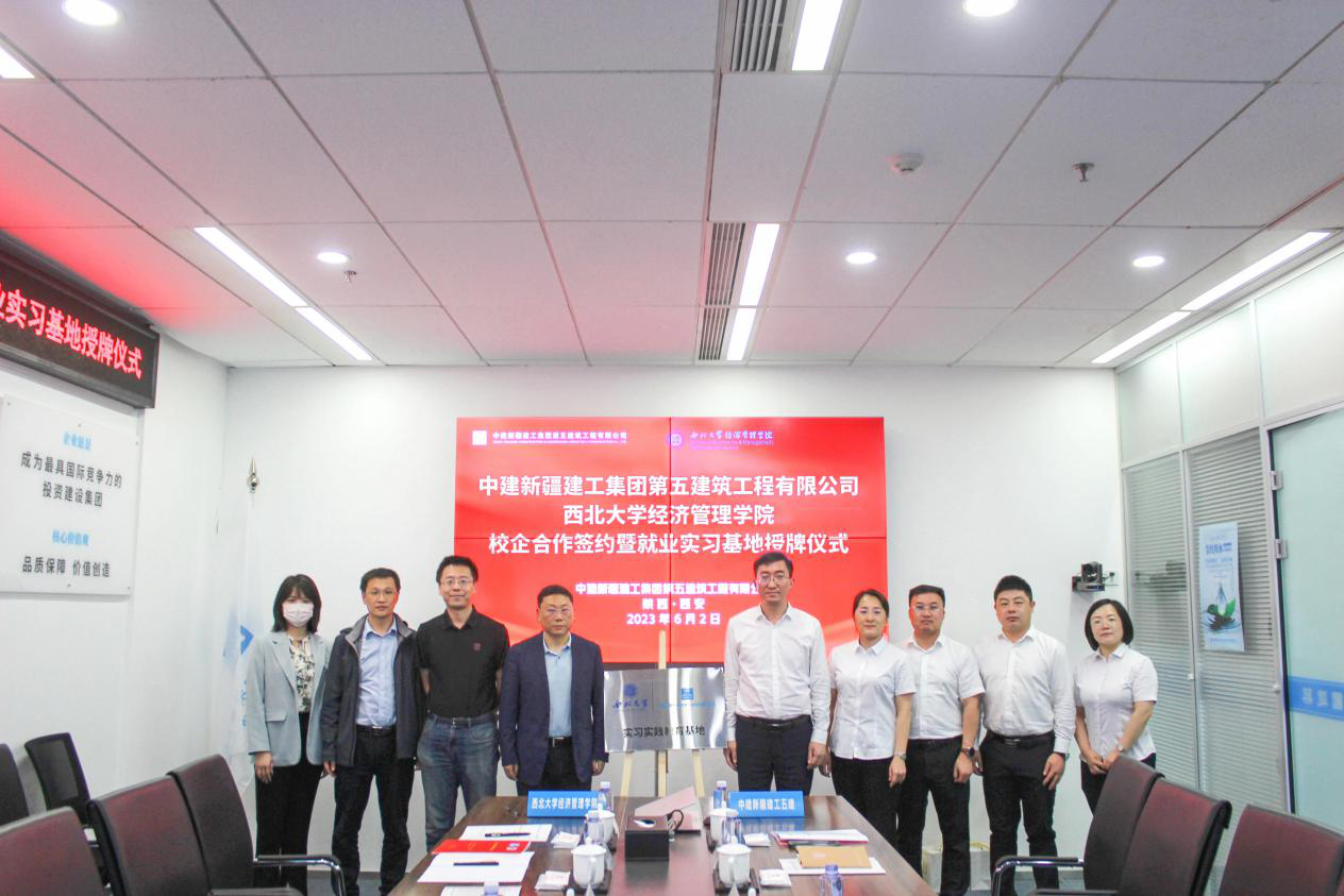 薛孟斌和杜勇共同签署校企产学研合作协议,并为“西北大学就业实习基地”揭牌。揭牌仪式后,双方参会人员就五建发展历程、陕西分公司发展趋势、学校发展历程与加强校企合作、产教融合方面进行深入交流。