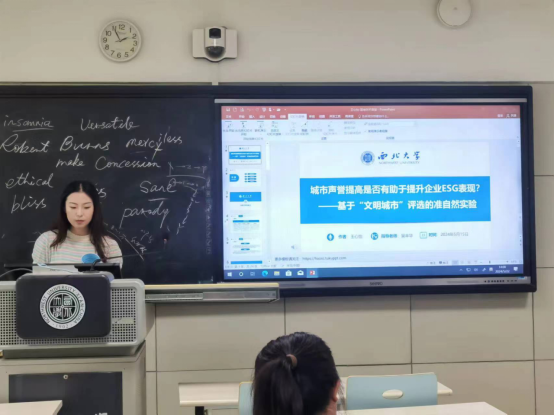 报告中,王心怡同学不仅详细阐述了研究方法和结论,还与同学们进行了科研经验的交流。面对同学们关于文章选题、模型选取以及数据搜集等方面的提问,她耐心解答,分享了自己的研究心得。她提到,选题是受到导师的启发,结合对城市声誉政策和ESG发展现状的观察,从而思考二者之间的潜在关联。在模型选取方面,她强调要具体问题具体分析,例如本文所用的DID模型适用于政策评估问题。至于数据搜集,她建议同学们在国家官方网站上进行,同时关注相关领域的公众号,以获取更多有价值的信息。