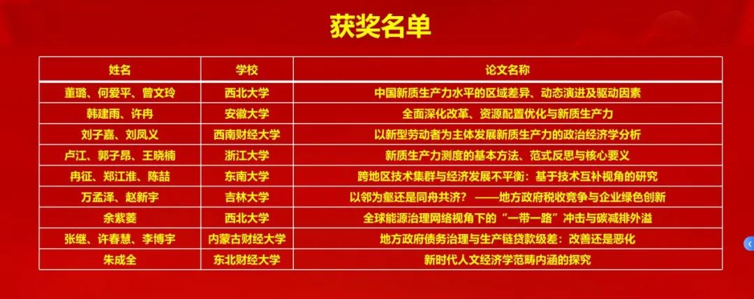 11月23日下午,参会的专家学者和青年学子围绕中国式现代化的理论基础与实践经验、全面深化改革的体制机制创新、健全因地制宜发展新质生产力体制机制、构建高水平社会主义市场经济体制、健全宏观经济治理体系、统筹推进城乡融合发展、高水平对外开放与产业发展安全、绿色发展与人与自然和谐共生的现代化、国家重大发展战略的部署与实施研究、习近平经济思想的地方实践、马克思主义政治经济学的创新发展等主题展开11场平行论坛。